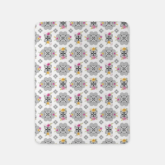 SHERPA BLANKET (SAND) - HMONG INSPIRED DESIGN - PINK AND YELLOW WATERCOLOR FLOWERS FLORALS - BLACK ON WHITE BG