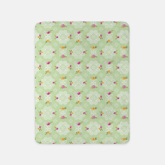 SHERPA BLANKET (SAND) - HMONG INSPIRED DESIGN - RED AND YELLOW WATERCOLOR FLOWERS FLORALS - WHITE ON GREEN BG