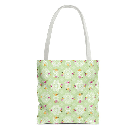 Tote Bag (AOP) - Hmong Inspired Design - Pink and Yellow Watercolor Floral Flowers - White on Green Background