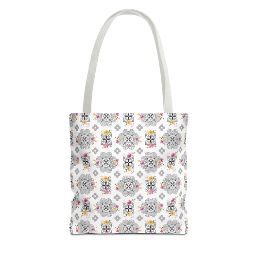 Tote Bag (AOP) - Hmong Inspired Design - Pink and Yellow Watercolor Floral Flowers - Black on White Background