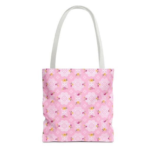 Tote Bag (AOP) - Hmong Inspired Design - Pink and Yellow Watercolor Floral Flowers - White on Pink Background