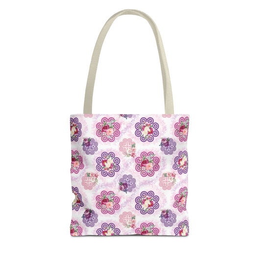 Tote Bag (AOP) - Hmong Inspired Design - Pink and Purple Roses Watercolor Florals Flowers - White on Purple BG