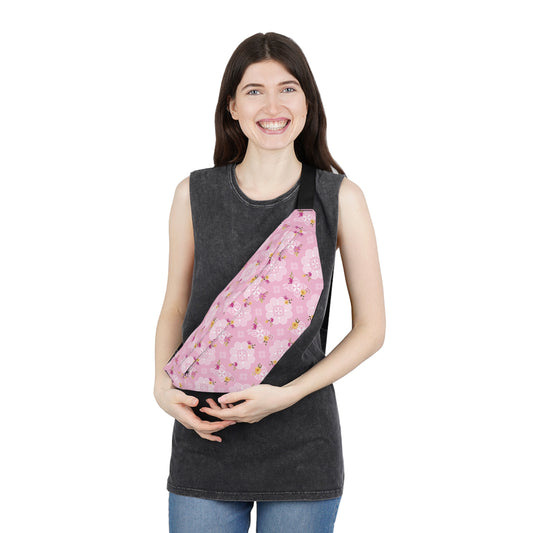 Large Fanny Pack - Hmong Inspired Design - Pink and Yellow Watercolor Florals Flowers - White on Pink BG