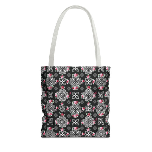 Tote Bag (AOP) - Hmong Inspired Design - Red and Pink Roses Watercolor Floral Flowers - White on Black Background